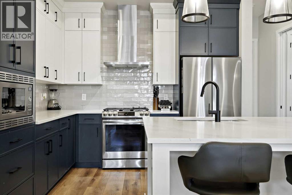 Experience elevated lakeside living in the heart of Mahogany — where timeless design meets exceptional comfort in this executive bungalow just moments from the water. With exclusive lake access, refined interiors, luxury vinyl plank throughout, and an expansive, thoughtfully planned layout, this residence offers a rare opportunity for single-level luxury in one of Calgary’s most prestigious communities.Soaring 10-foot ceilings and oversized windows define the main living space, creating an atmosphere that is both grand and inviting. The chef’s kitchen is a standout, blending beauty and function with its striking two-tone cabinetry, premium stainless steel appliances (including a gas range and range hood), generous pantry, and a statement island with breakfast seating — ideal for both casual mornings and elegant entertaining.The open concept living room, that connects both the kitchen and dining room, exudes warmth and sophistication with luxury vinyl plank flooring, a designer gas fireplace wrapped in herringbone tile, and captivating views of Mahogany Lake just beyond.The primary bedroom features a spacious walk-in closet and a spa-inspired ensuite complete with marble-style porcelain tile, a deep soaker tub, glass-enclosed shower, double vanity, and polished chrome fixtures — every detail designed for indulgent relaxation. A stylish 2-piece powder room completes the main level.Downstairs, the fully finished lower level offers exceptional versatility with a spacious family room, two additional bedrooms — both with their own walk-in closets — and a beautifully appointed 4-piece bath. Ideal for guests, extended family, or quiet evenings in.Outside, enjoy your own private courtyard-style patio and yard space, perfectly positioned off the mudroom (which conveniently includes the washer and dryer). The double detached garage offers ample storage with an electric vehicle charger and alley access, while central air conditioning and a water softener add thoughtful tou ches to enhance everyday living.Located in the award-winning lake community of Mahogany, you’ll have exclusive lake access, scenic walking trails nearby, as well as schools, shopping, dining, and more.This is more than a home — it’s a lifestyle. Schedule your private tour today and discover the elevated ease of bungalow living by the lake. (id:48488)